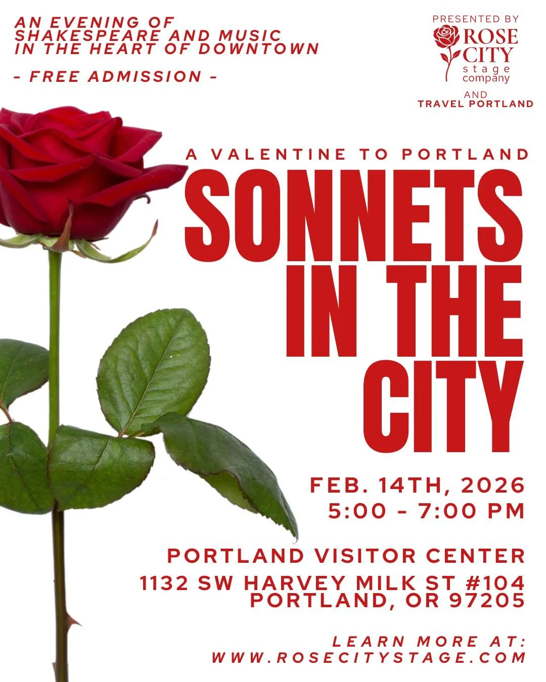 Sonnets in the City, a Valentine to Portland is a special Valentine’s Day activation presented by Rose City Stage Company in collaboration with Travel Portland. Taking place at the downtown Travel Portland Visitor Center, this intimate, free event features a live reading of Shakespeare’s most enduring love sonnets, performed in a come-and-go format designed for a romantic pre-dinner stop. Inviting locals and visitors alike to pop in, linger for a few poems, or stay for the full program, Sonnets in the City celebrates love, language, and the timeless magic of Shakespeare in the heart of the Rose City.